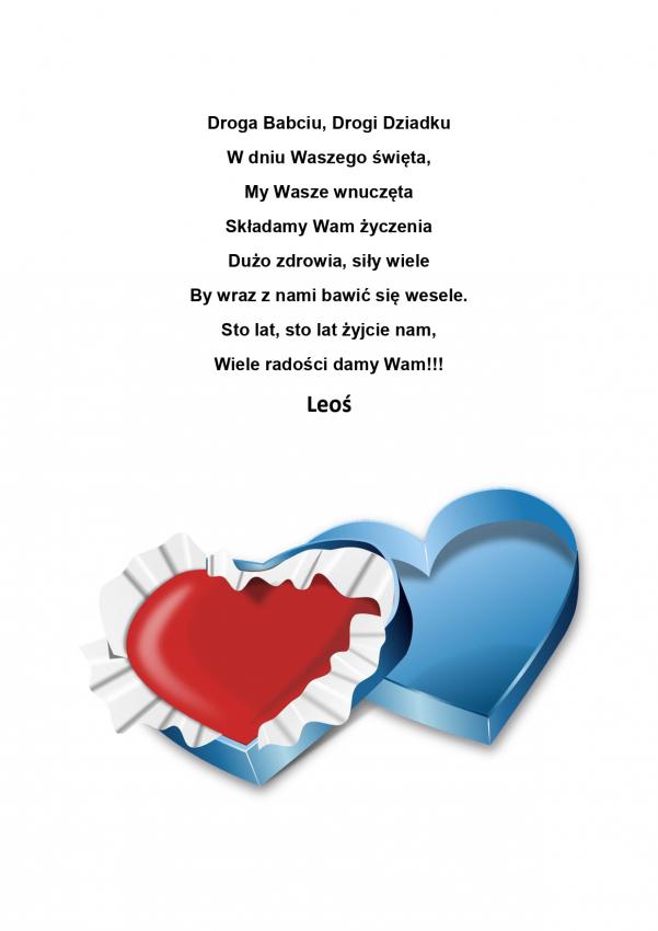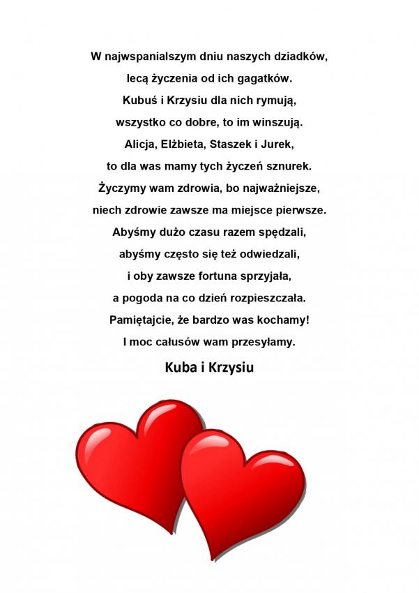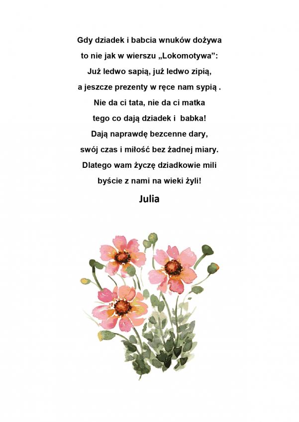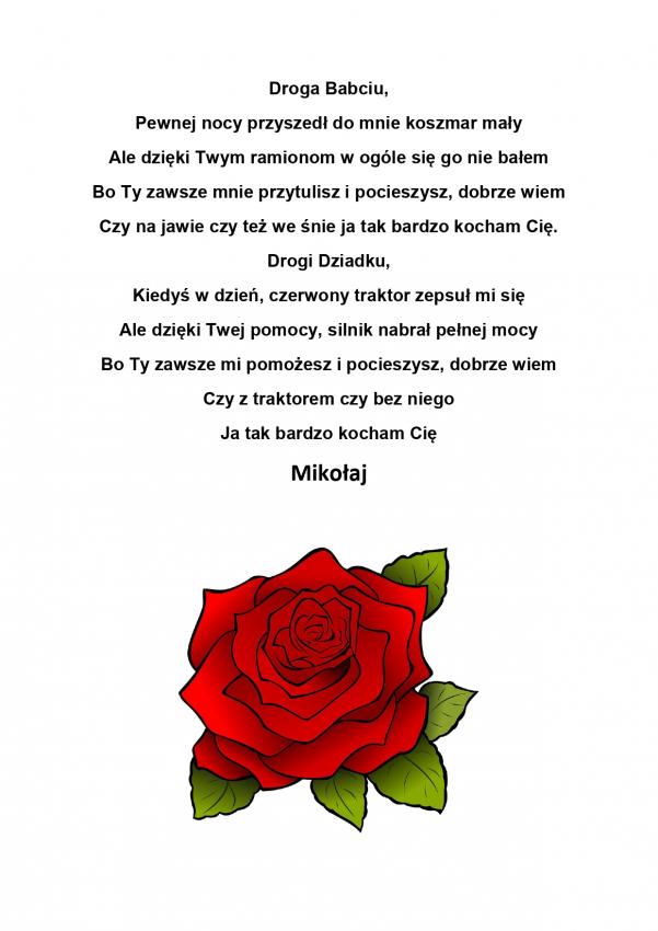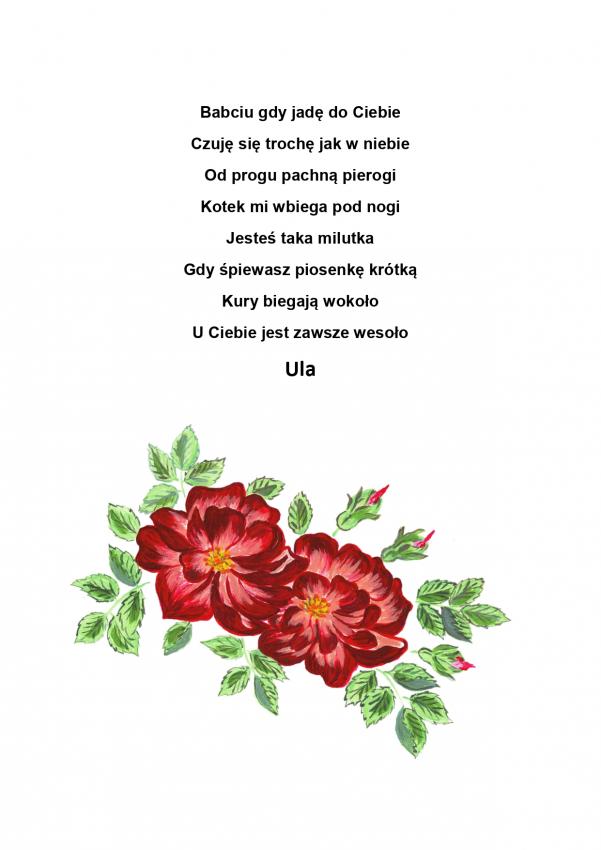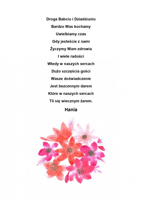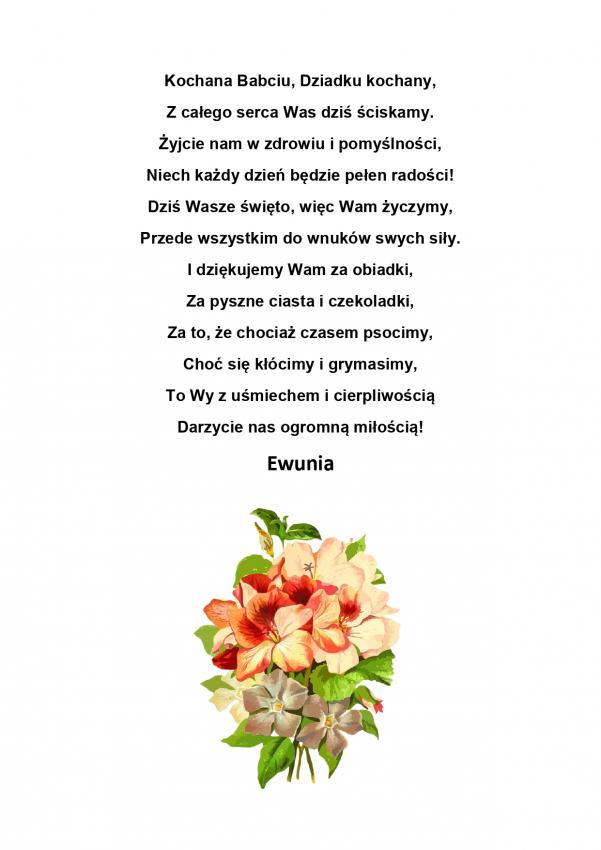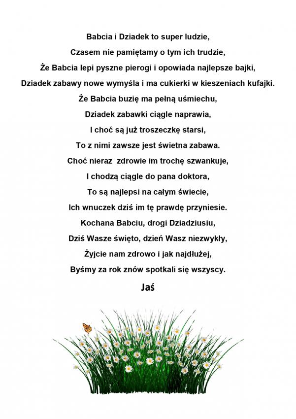 W tym roku nasze Przedszkolaki w ramach konkursu rodzinnego przygotowały wierszowane życzenia dla Babć i Dziadziusiów. Będą prezentowane podczas występu, ale z racji kwarantanny będzie on przeniesiony dopiero na luty. Ponieważ Dzień Babci i Dziadzia jest już w ten weekend, poniżej przedstawiamy wszystkie dzieła, które dotarły do Przedszkola. Każdy z wierszy jest oryginalny i piękny! Gratulujemy ich Autorom, a Babciom i Dziadziom życzymy, by wszystkie zawarte w nich słowa się spełniły!