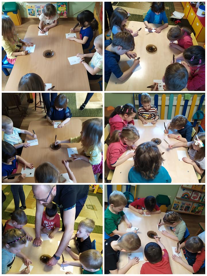 Warsztaty edukacyjne Pana Dzieciaka: "Narzędzia pisarskie - od gęsiego pióra po maszyny do pisania". Dowiedzieliśmy się jak rozwijało się pismo na przestrzeni lat. Sami pisaliśmy piórami na kawałkach papieru, patyczkami na glinianych tabliczkach oraz na maszynach do pisania.