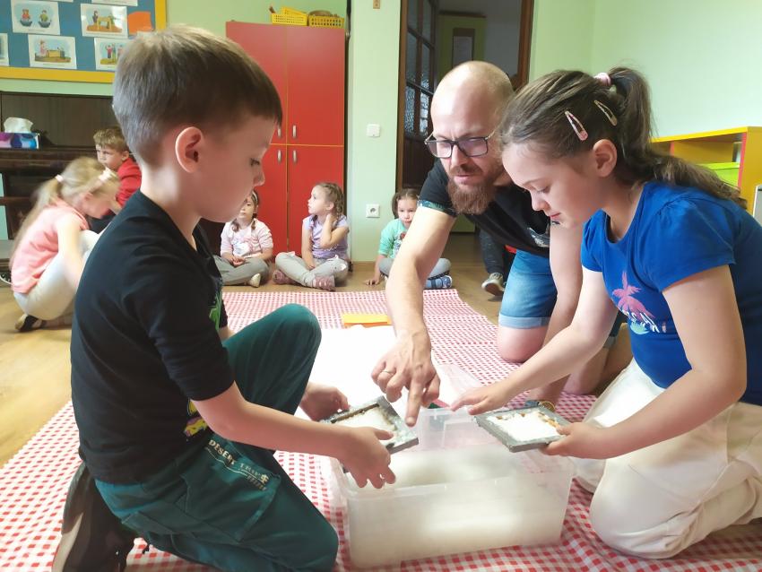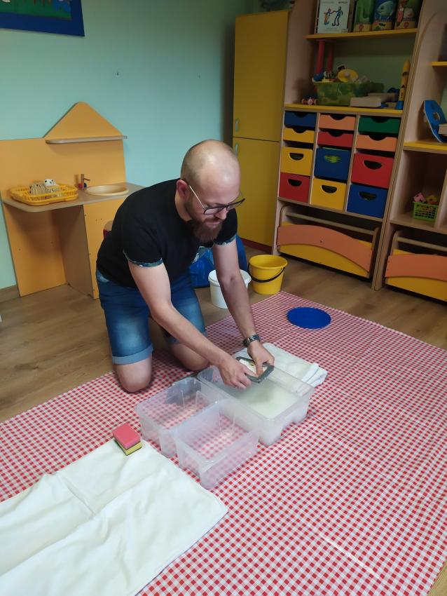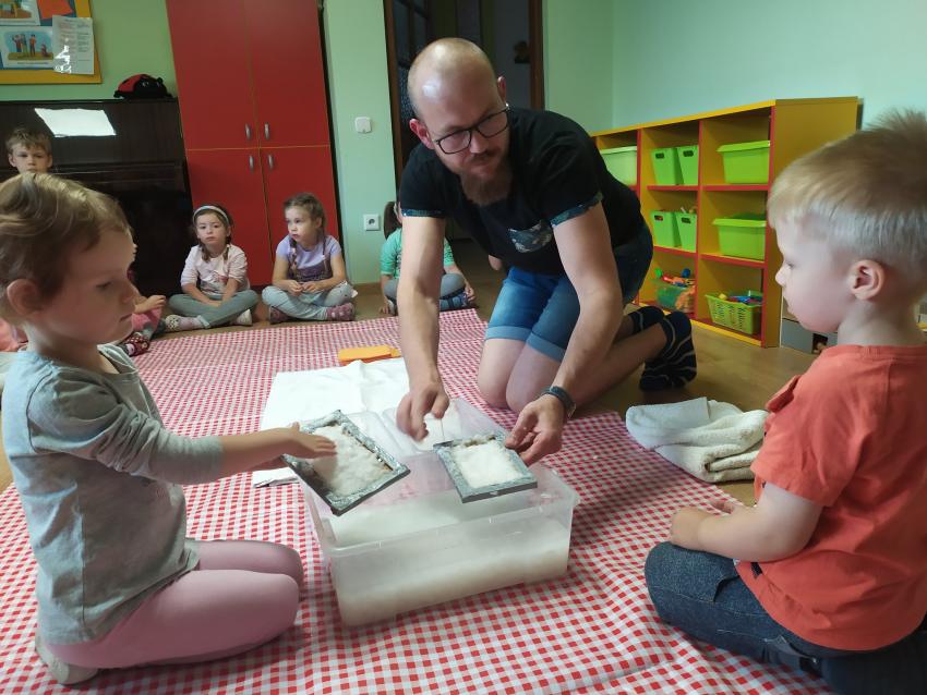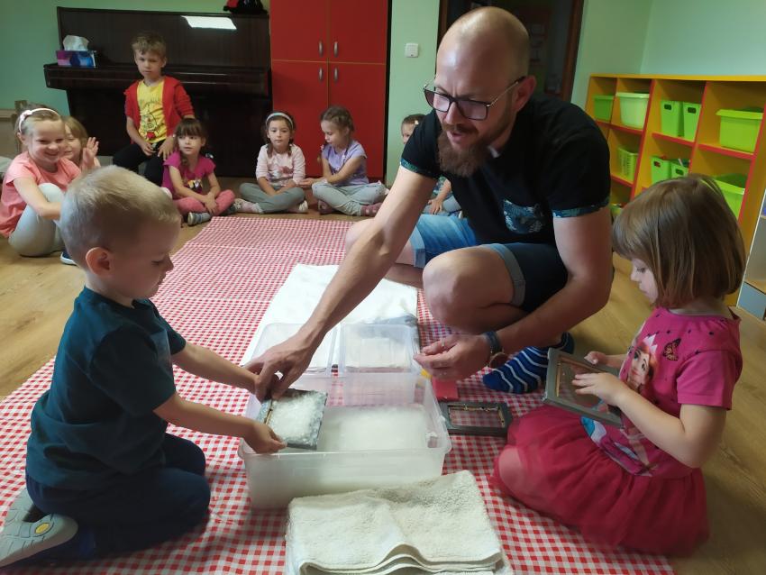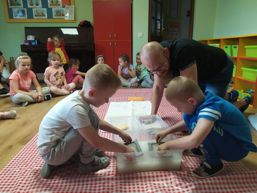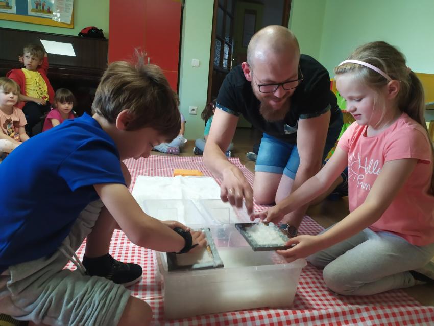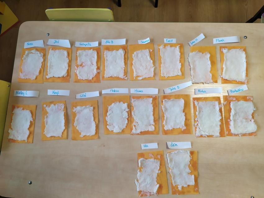 W poniedziałek po raz kolejny gościł u nas Pan Dzieciak. Tym razem rozmawialiśmy o papierze. Każdy chętny wyprodukował dla siebie karteczkę papieru czerpanego. Było to bardzo ciekawe doświadczenie!