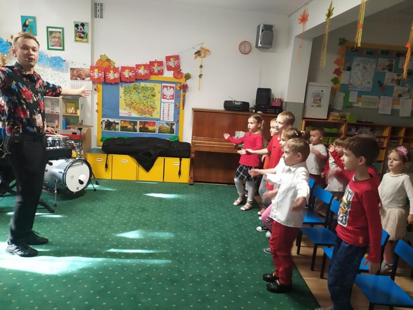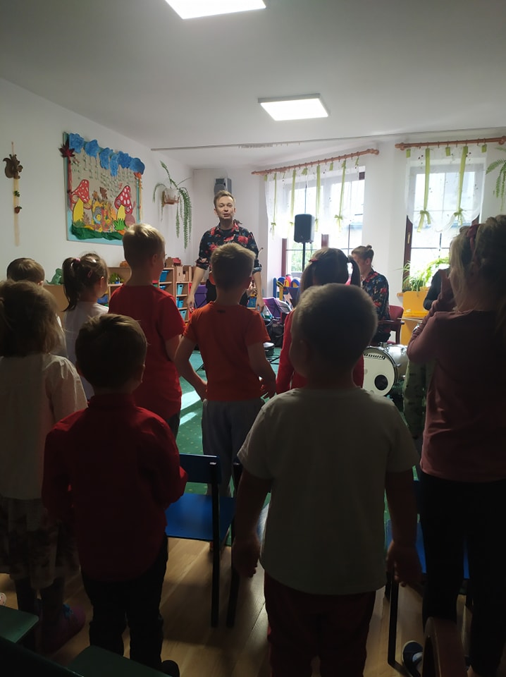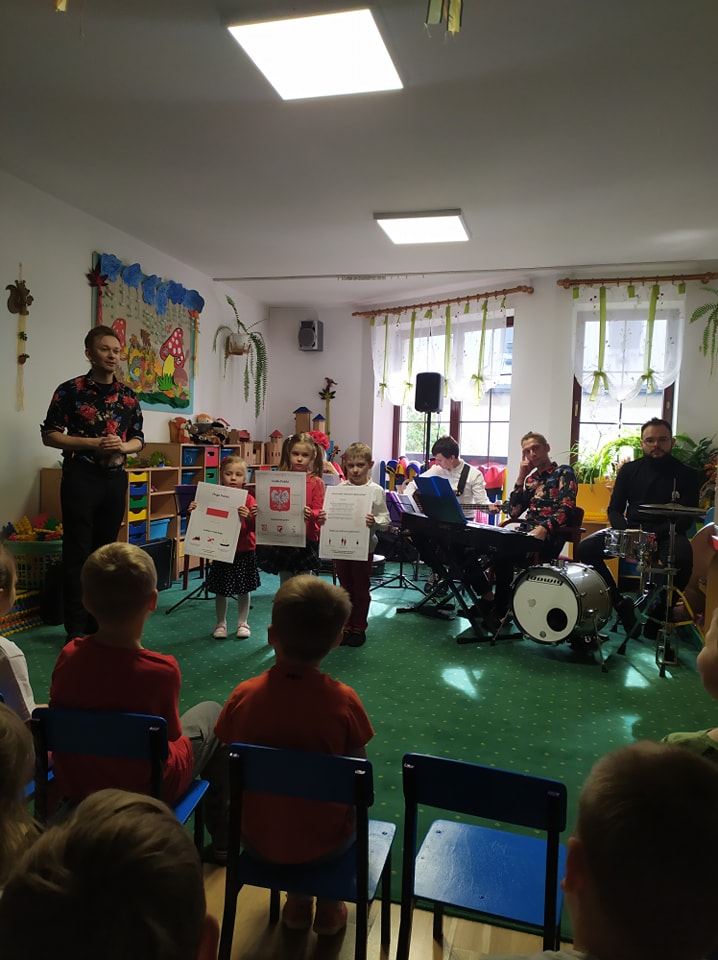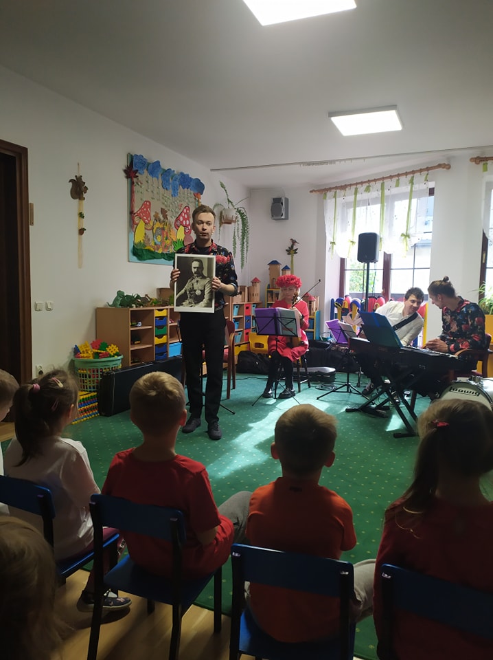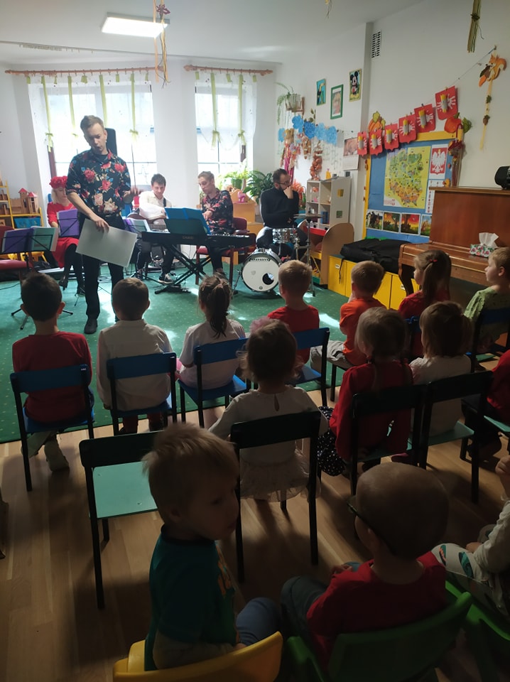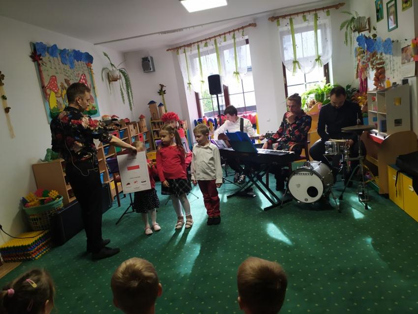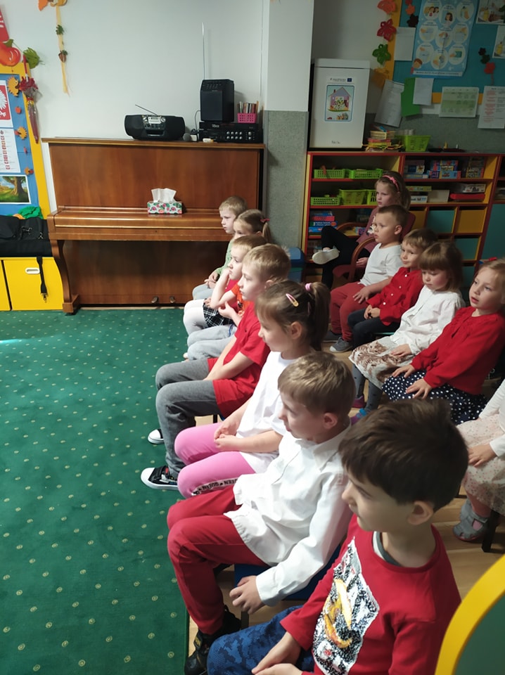 9.11. gościliśmy u nas muzyków z Mobilnej Filharmonii. Wspólnie wykonaliśmy kilka utworów patriotycznych i przypomnieliśmy sobie niektóre fakty historyczne związane z naszym narodowym Świętem Odzyskania Niepodległości. Podczas przygotowań do 11.11. odśpiewaliśmy również hymn Polski, a także wywiesiliśmy naszą flagę na budynku Przedszkola.