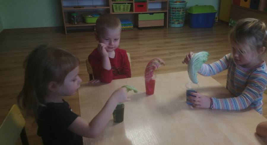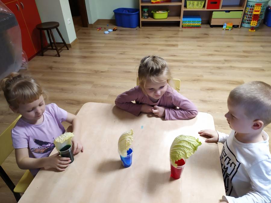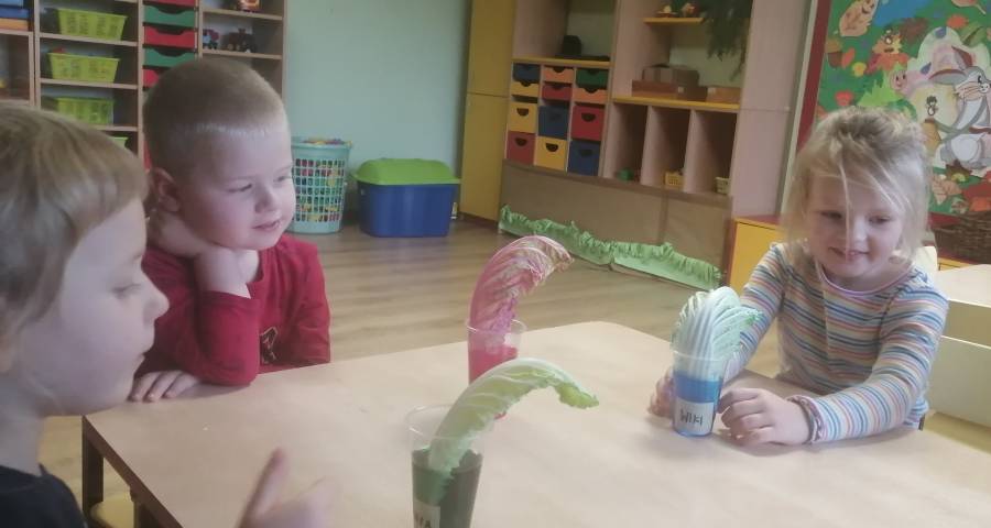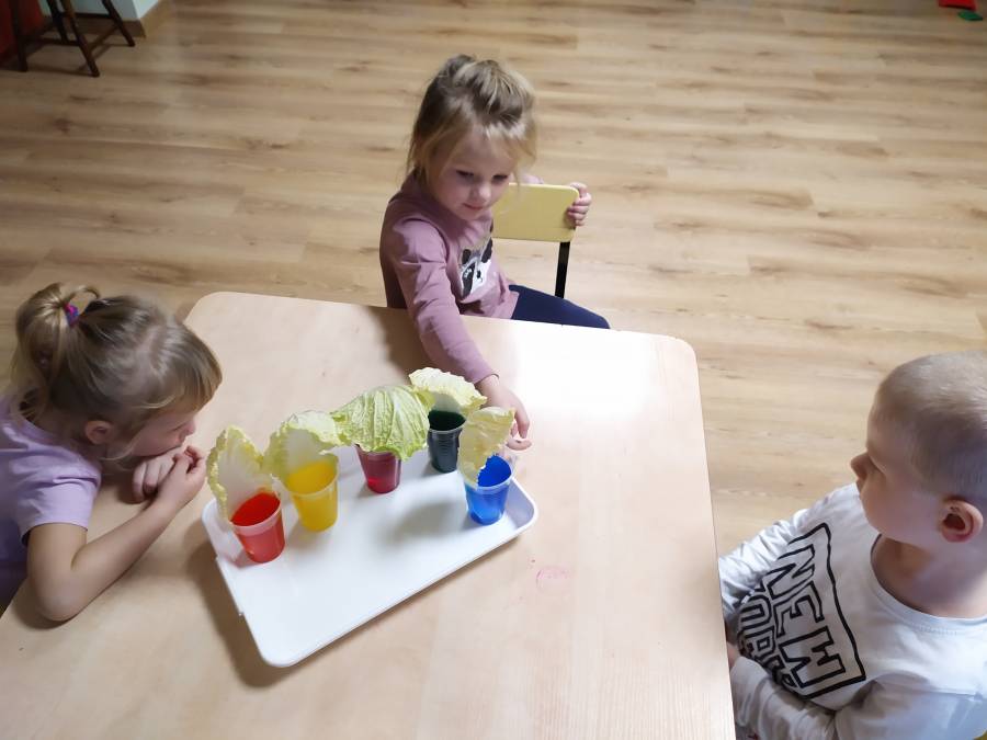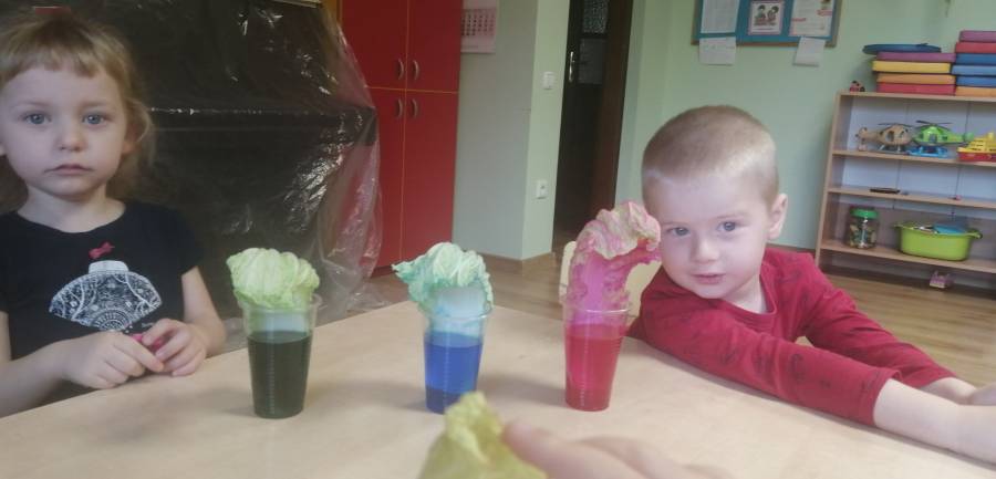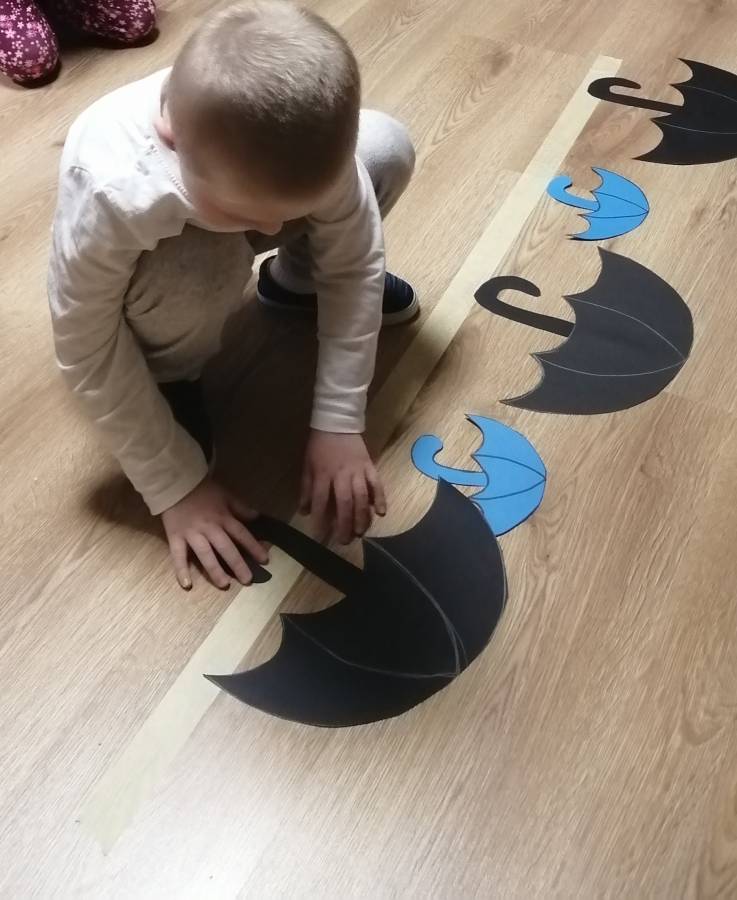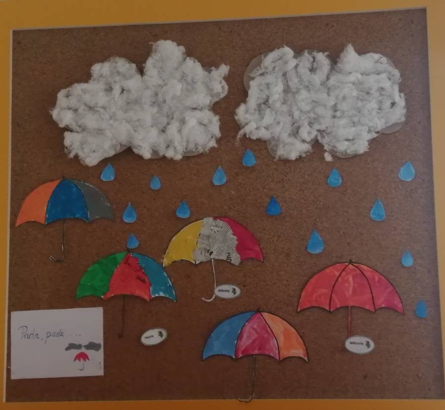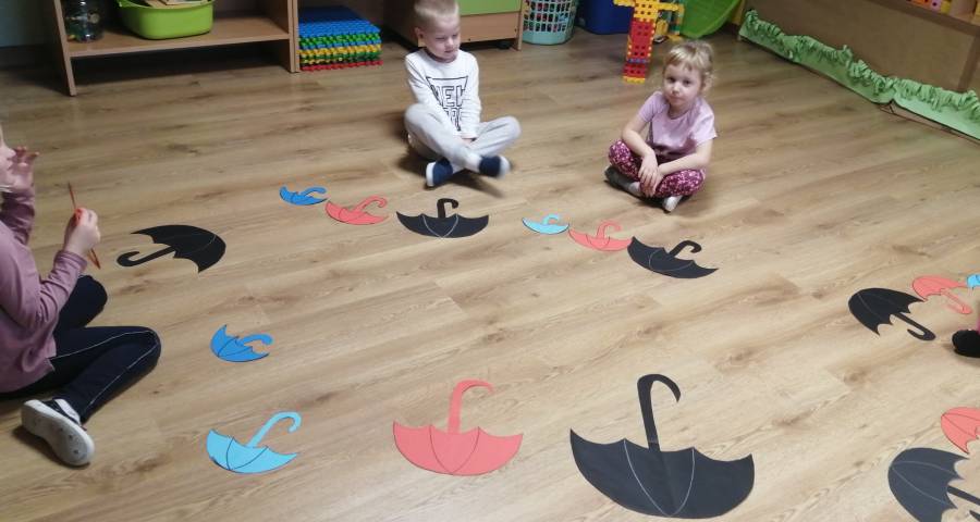 Maluszki z grupy „Biedroneczek” podczas spaceru obserwowały zmiany zachodzące w przyrodzie późną jesienią. Słuchały opowiadania o „Rodzinie parasoli” w trakcie którego bawiły się układając parasole od największego do najmniejszego. Tworzyły również parasolowe rytmy. Wykonały zabawę badawczą, barwiąc wodę bibułą, a następnie sprawdzały czy rośliny piją wodę i co się stanie jeżeli wypiją kolorową. Codziennie obserwowały zmiany jakie zachodzą na liściach. Każde dziecko wykonało swój kolorowy parasol.