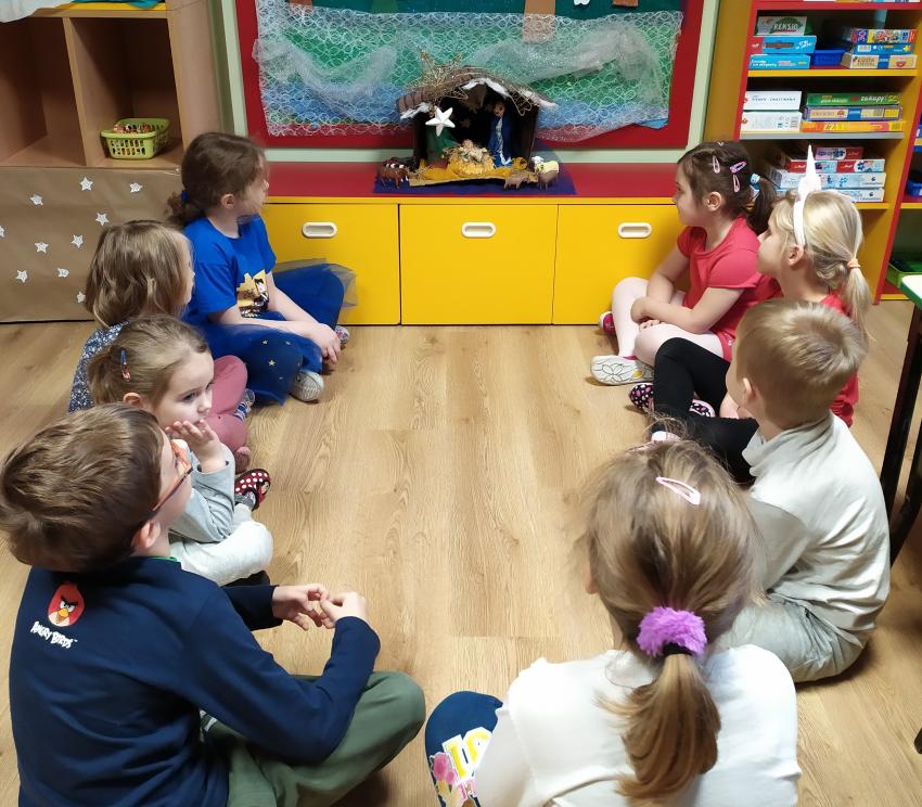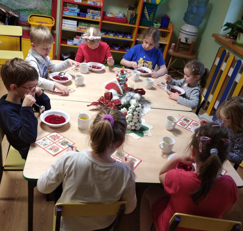 Czas oczekiwania na Święta Bożego Narodzenia u starszaków zakończył się wspólną wigilią, która odbyła się 22 grudnia. Przy choince rozmawialiśmy o tradycjach bożonarodzeniowych, śpiewalismy kolędy i pastorałki. W tym roku nie łamalismy się opłatkiem, ze względu na pandemię koronawirusa. Wszyscy wszystkim życzyli zdrowych i wesołych świąt. Wspólnie przy pięknie ozdobionym stole zjedliśmy wigilijny obiad.