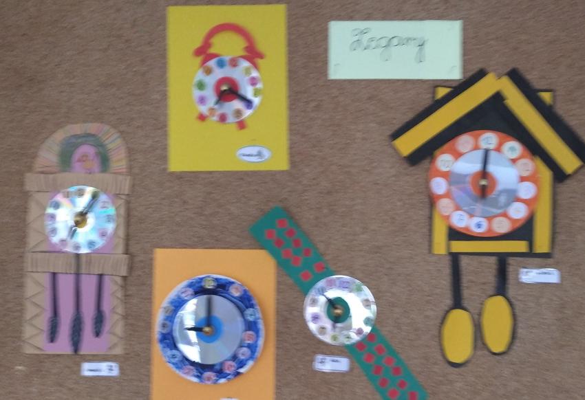 "Ma cyferki lub wskazówki, aż trudno uwierzyć, że mechanizm ten malutki potrafi czas mierzyć"- starszaki bez problemu rozwiązywały zagadki dotyczące zegarów. Największą frajdą była konstrukcja zegarów, z płyt CD, papieru, talerzyków papierowych. Mocowanie wskazówek za pmocą korka i pineski. Powstały różne zegary: na rękę, budzik, zegar z kukułką, zegar wahadłowy, ścienny.