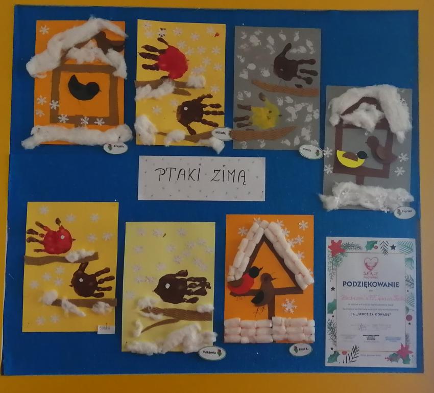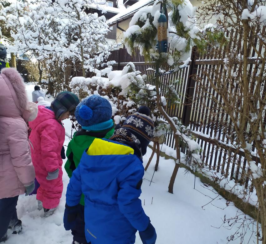 W związku z tym, że zimą trudno jest znaleźć ptakom pożywienie, w minionym tygodniu przedszkolaki z grupy „Biedroneczek” zapoznały się z tematem ich dokarmiania. Poznały nazwy ptaków (wróbel, gil, sikora, sroka) ich wygląd oraz preferencje dotyczące rodzaju pokarmu. Odwiedziliśmy również karmnik w naszym przedszkolnym ogrodzie. Nie zabrakło też zabaw na świeżym powietrzu. Dzieci ćwicząc sprawność manualną wykonały piękną pracę plastyczną.