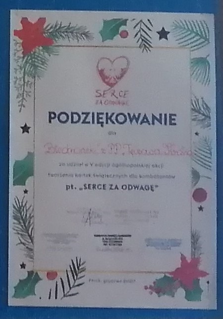 Cała grupa otrzymała podziękowanie za udział w akcji "Serce za odwagę", o której można przeczytać kilka wpisów niżej.