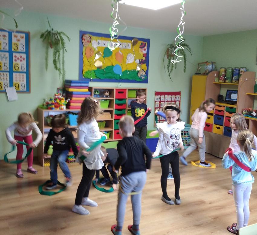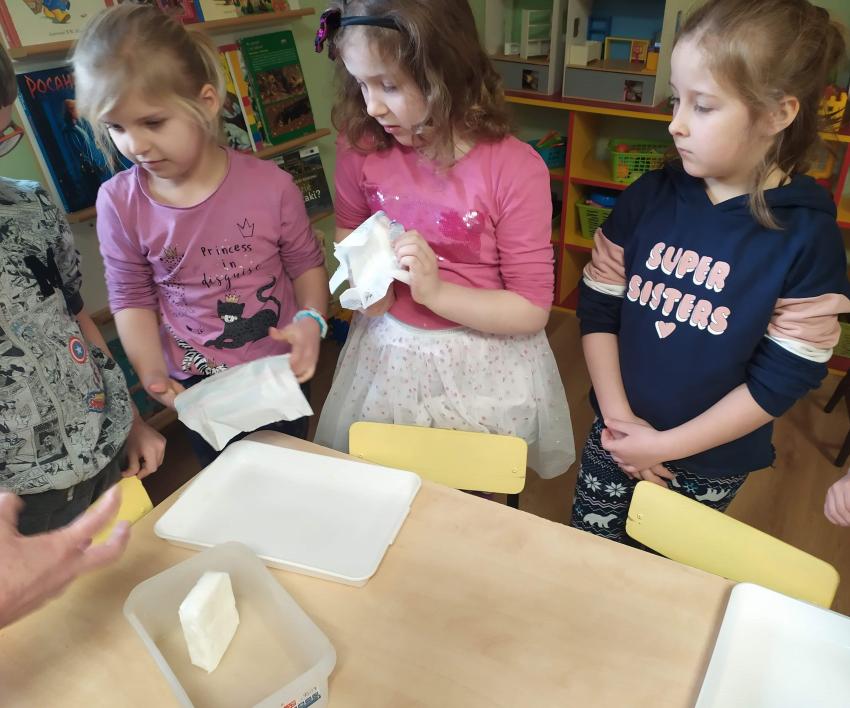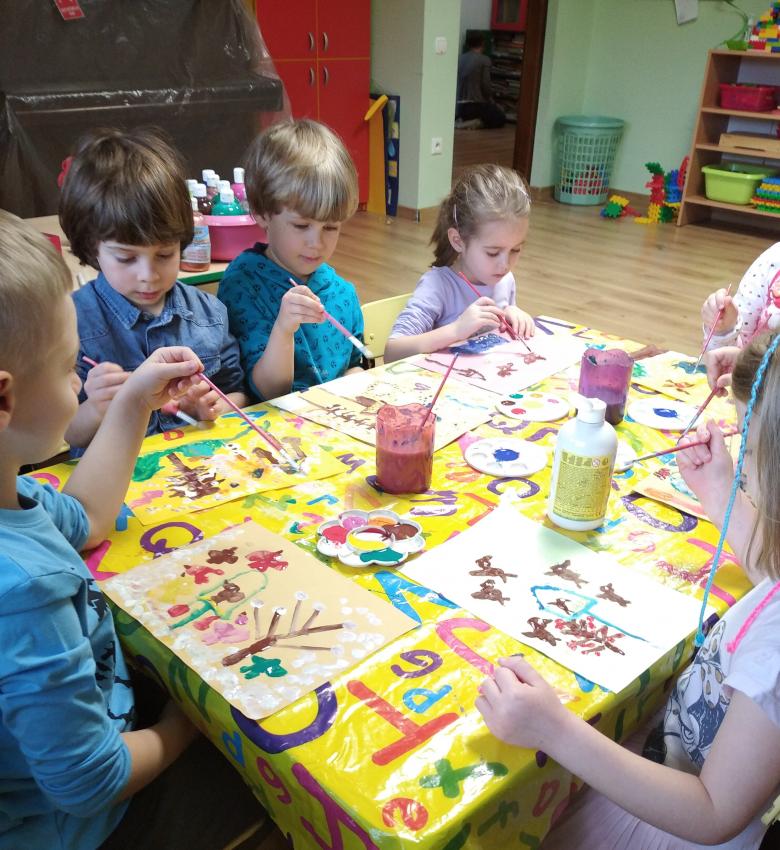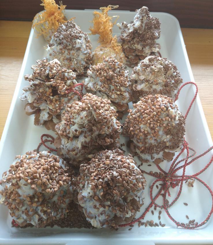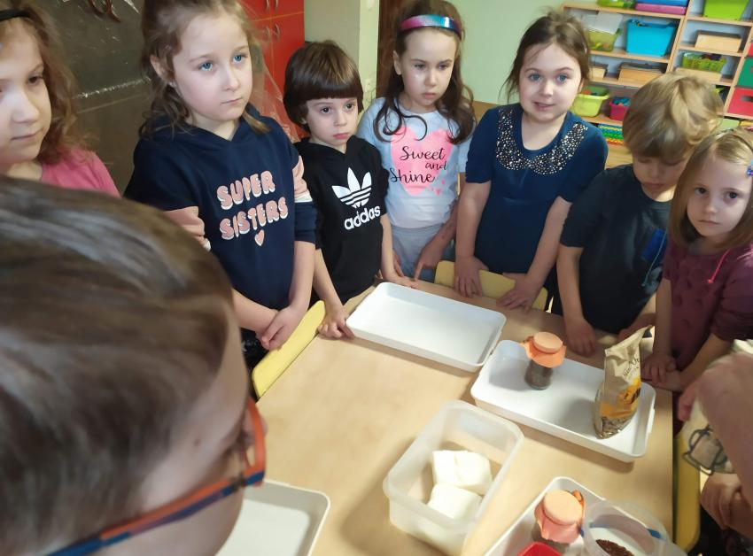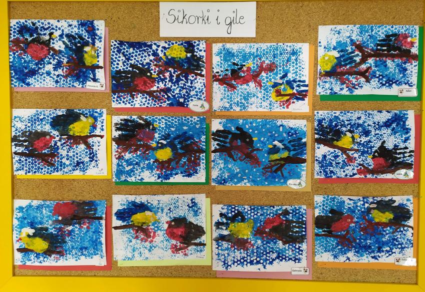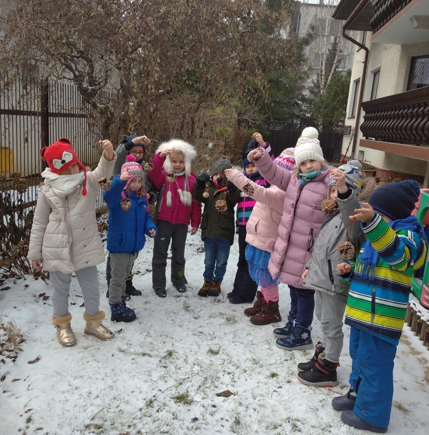 Dzieci z grupy "Papużek" i "Wróbelków" przygotowały "ptasi bar". W tym celu wykorzystały do tego szyszki, smalec, ziarenka i zboża. Dużym wyzwaniem dla dzieci okazał się zapach i konsystencja smalcu, ale dzieci dzielnie działały aby pomóc ptaszkom przetrwać zimę.