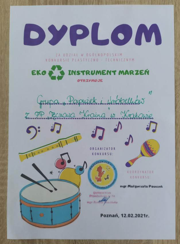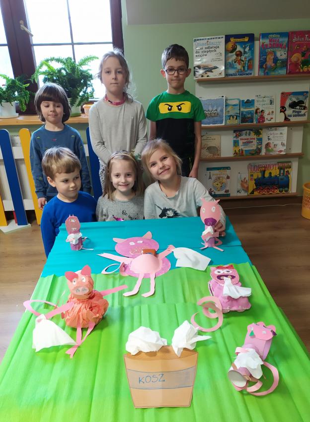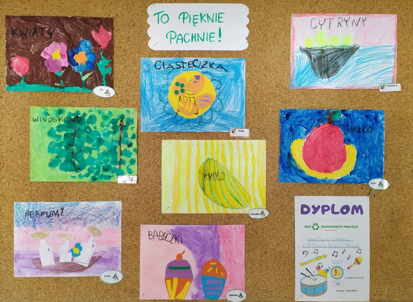 "Papużki" i "Wróbelki" kontynuowały w tym tygodniu swoją przygodę z programem "Czyściochowe Przedszkole" Rossmanna. Tym razem poznały świnkę Zakatarzynkę, która miała duży problem z higieną nosa. Dzieci badały różne sybstancje jedynie po zapachu, dowiedziały się, dlaczego niektóre rzeczy brzydko pachną, wiedzą już też jak powinna wyglądać higiena nosa i co zrobić ze zużytą chusteczką higieniczną. Powstały piękne prace plastyczne. Nie brakło też zajęć ruchowych, które wzmacniają odporność organizmu. Nasza grupa otrzymała dyplom za udział w konkursie na "Eko-instrument".