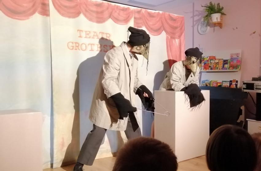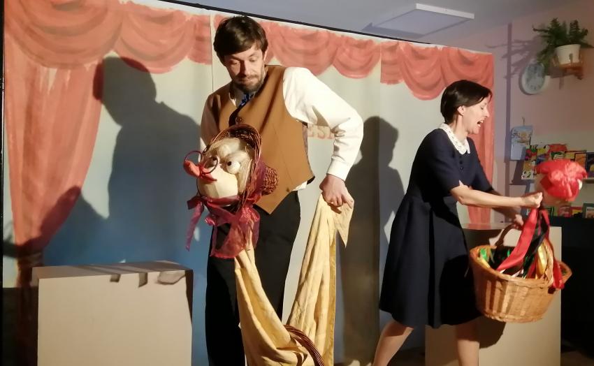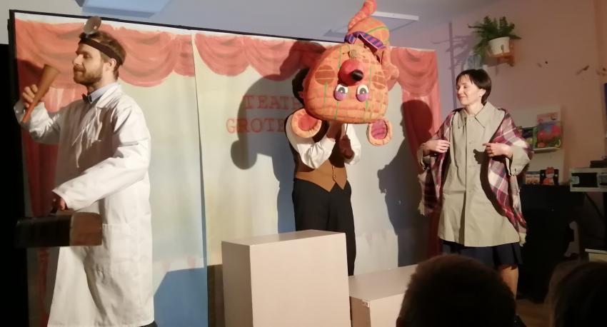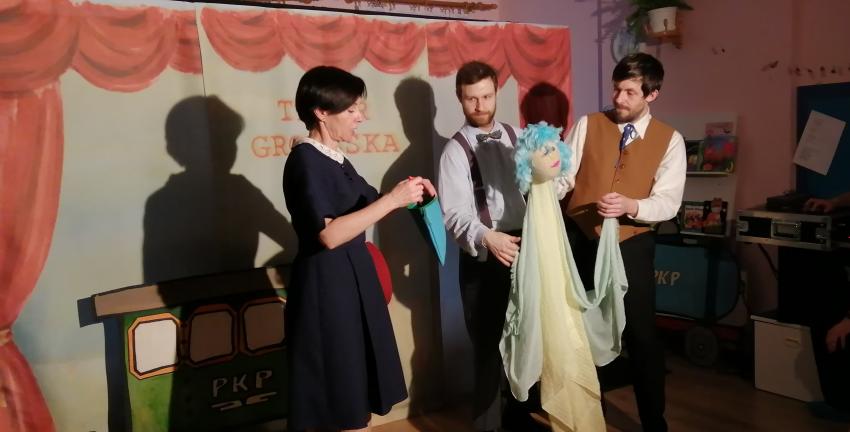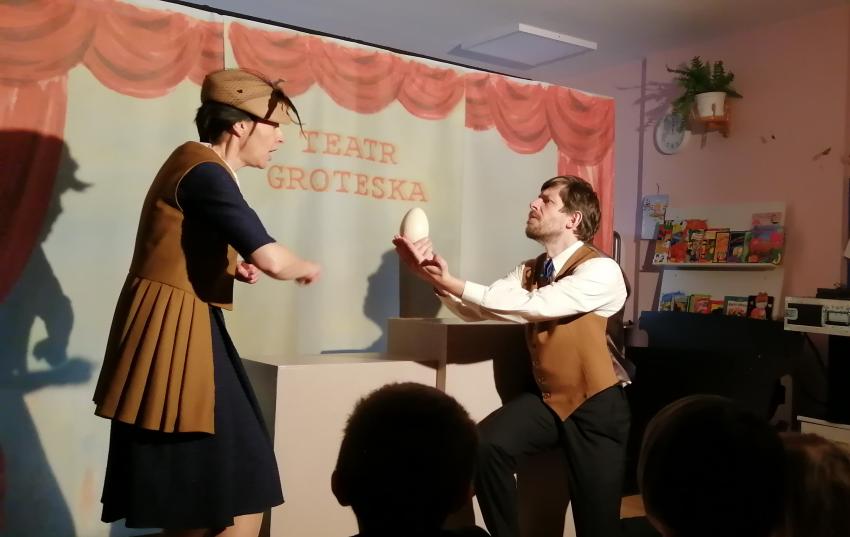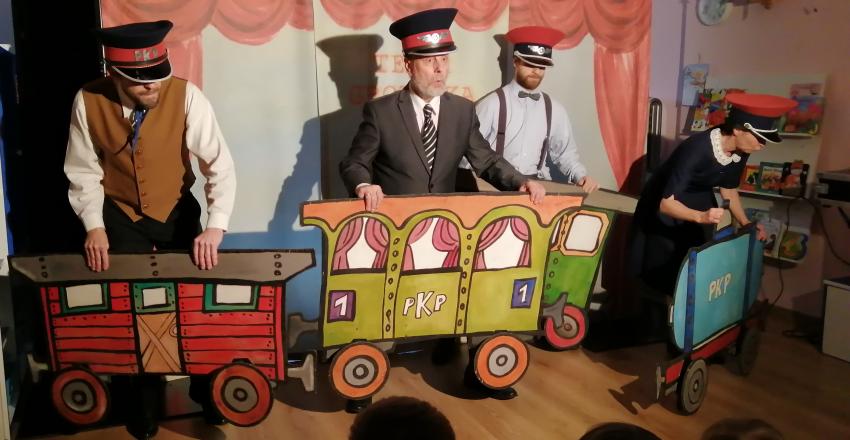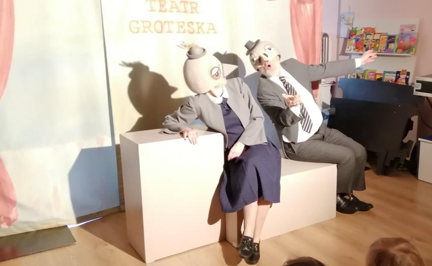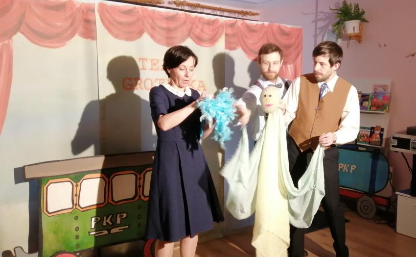 W poniedziałek 1 marca nasze przedszkole gościło aktorów z Teatru Groteska w ramach projektu „Groteska w drodze”. Aktorzy przedstawili inscenizacje wierszy Jana Brzechwy, Juliana Tuwima, Wandy Chotomskiej czy Stanisława Jachowicza. Dzieci poczuły się, jak w prawdziwym teatrze. Przygotowana została profesjonalna dekoracja, rekwizyty, lalki, stroje. Aktorzy oprócz prezentacji wierszy przedstawili dzieciom sposób na zrobienie lalki – kukiełki. Przedszkolaki były zaangażowane i wręcz oczarowane ciekawą i dynamiczną grą aktorską. Moc teatru, mimo obecnej sytuacji pandemicznej, dotarła również do przedszkola, dzięki czemu wszyscy mogli uczestniczyć we wspaniałym wydarzeniu teatralnym.