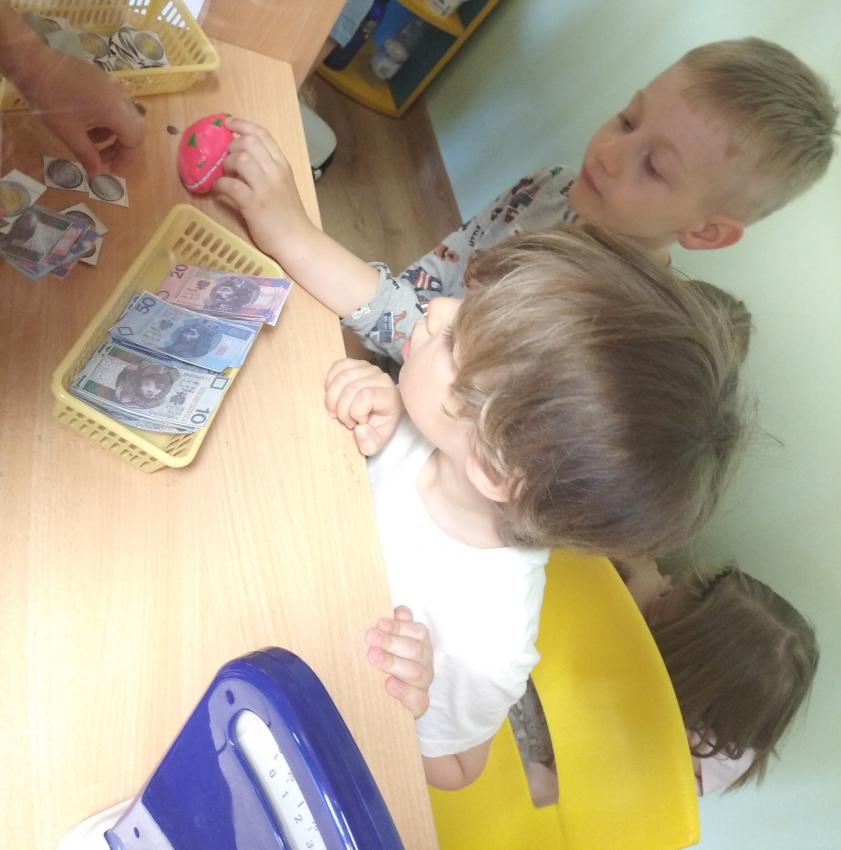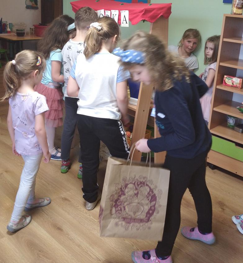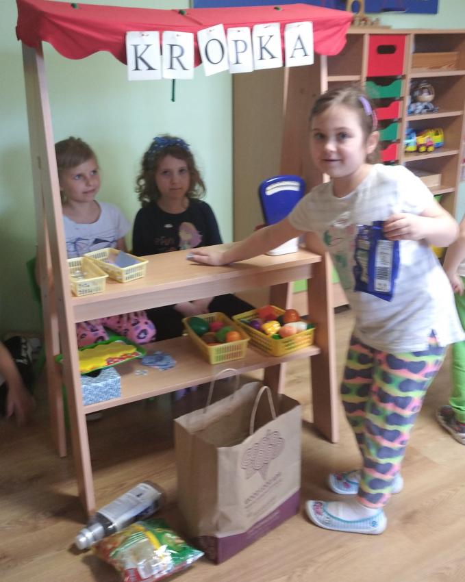 "Papużki" i "Wróbelki" założyły w sali sklep spożywczy - "Kropka" według pomysłu dzieci. Zabawa tematyczna w sklep to niesamowita okazja do nawiązywania kontaktów, rozmów, odtwarzania ról społecznych i wzmacniania pozytywnych zachowań.